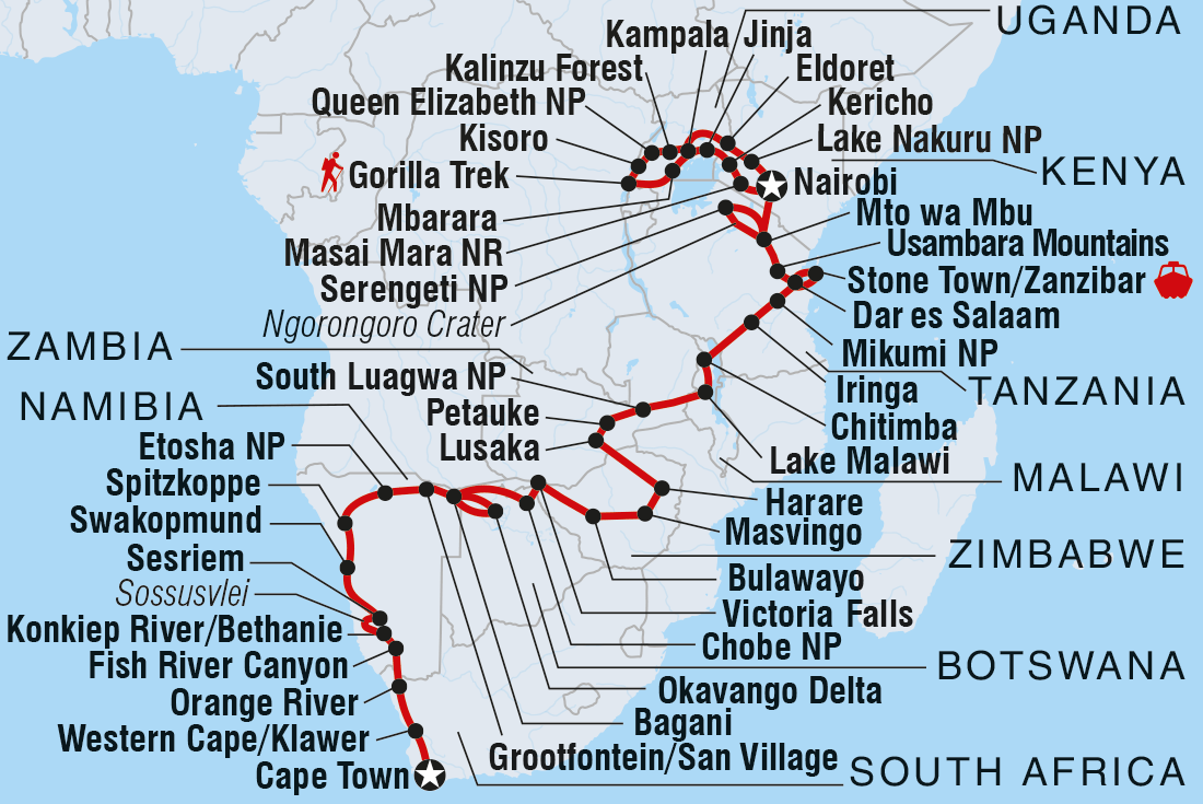 Looking for Africa with the lot? Ask and you'll receive on this epic trip across ten countries in 63 unforgettable days. Get breathtakingly close to animals more often seen in zoos and nature documentaries, from endangered mountain gorillas and lumbering elephants to ferocious lions and tiny dik-dik antelope. Along the way, meet people from various cultures and communities: Zanzibar spice growers, Lake Malawi fishermen and San people. Nairobi to Cape Town and all the adventure in between – this trip will leave you amazed by the breadth of life and culture and the beauty of nature gracing this spectacular continent.