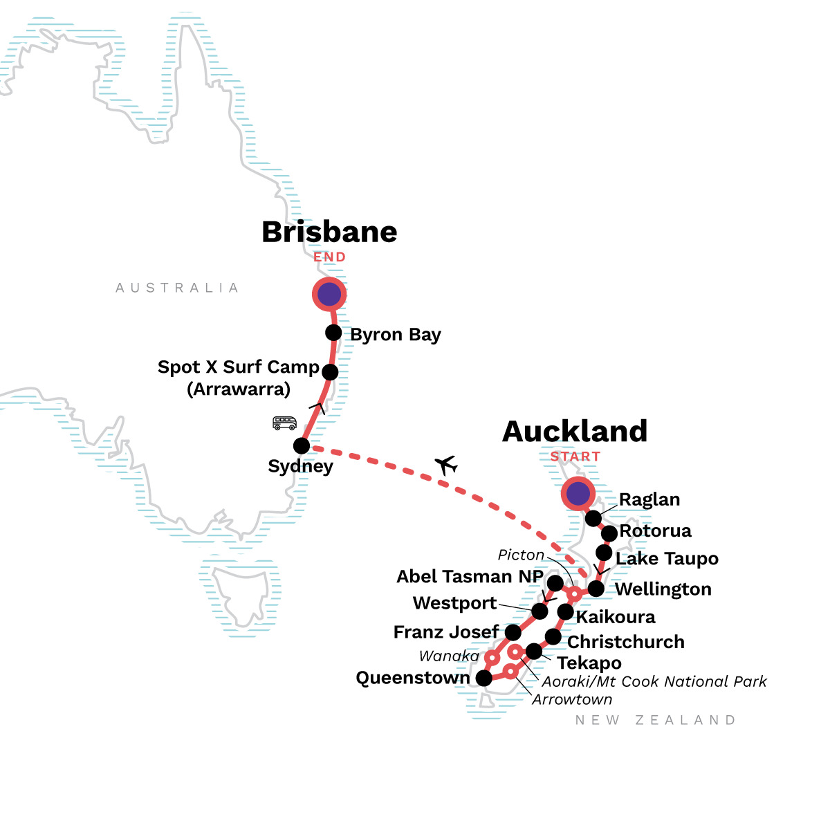 If New Zealand’s been calling your name, why not answer with a side of Australia? This 30-day adventure takes you from the tip of New Zealand’s North Island to the depths of the South. Immerse yourself in Maori culture, surf, kayak, and explore breathtaking National Parks. Then, hop over to Australia to soak up some sun and surf along the coast. Overnight at a surf camp, trek to spot koalas, and cap off your journey in vibrant Brisbane — whether you’re ready to chill or crave more Aussie adventures, this trip’s got you covered.