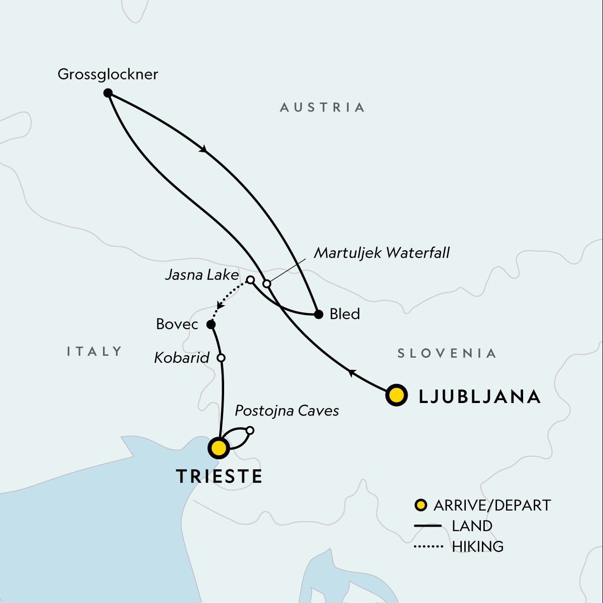 Exclusive inclusions: Transport - Private Coach day trip from Trieste Postojna Cave/Krvavi Potok/last stage AdriaActivity - A private, before-hours visit to Postojna Cave alongside a cave specialist offers rare access to a subterranean cathedral. Enter in the soft light of early morning, securing a peaceful audience with the cave before the arrival of the midday crowds. This intimate perspective allows you to stand in awe of the ancient stalactites as the site slowly awakens, revealing the delicate artistry of nature in its most peaceful state.Activity - Hiking the penultimate stage of the Alpe-Adria-Trail reveals a profound display of geographical drama. Starting in Krvavi Potok, you begin on the high, silent limestone plateau of the Slovenian Karst. As you cross into Italy near Basovizza, the architecture shifts subtly and the trail joins the Giordano Cottur Bike Path, a historic route tracing the old Austro-Hungarian railway line. The experience reaches its crescendo as you descend into the rugged, sun-drenched Italian canyon of Val Rosandra. Leaving the flat railway path behind, you dive into a deep limestone gorge that evokes the scale of the Grand Canyon, yet remains deeply rooted in its Mediterranean soul.Transport - Settle in and scan the scenery from the convenience of a private vehicle.Transport - Settle in and scan the scenery from the convenience of a private vehicle.Accommodation - Grand Hotel Duchi d'Aosta