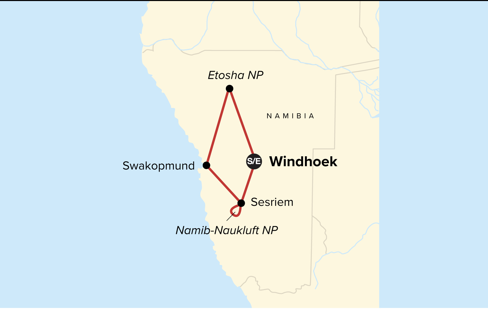 Exclusive inclusions: Activity - Travel along scenic roads to Walvis Bay and arrive at the nearby salt pans and pink lakes for photographs of the unique environment. Drive along the beach at the high tide waterline passing seals and birdlife. Along this route the guide will conduct a mini living desert tour in the lower Kuiseb Delta, searching for the small five; geckos, sidewinder snakes, chameleons, scorpions, and toktokkies. Learn more about the Namib Desert from our guide as the group drives to the entrance of Naukluft Park, where we might see oryx, springbuck, and ostrich. In the park, if the tide allows we will drive along the beach towards Sandwich Harbour. If it’s high tide, the drive will be through the dunes above the ocean. Pause at various viewpoints like Kodak Viewpoint and admire the wonder of desert meeting the ocean—a truly remarkable sight. Cap off the experience with a thrilling 4x4 ride through the towering dunes and stop en route to enjoy lunch at a private location. Search for more wildlife as the group exits the park returning to Swakopmund.Activity - Visit the community of Mondesa Township with an expert resident guide. Learn about its daily life, history and traditions through an immersive experience with the welcoming people that live here. Visit its lively market for an introduction to traditional foods like wild spinach, mopane worms, and dried kapenta fish. Also visit an arts-and-crafts shop that helps train the township’s youth in traditional crafts. Drop by a shebeen (tavern) to enjoy a favourite drink, and meet some local residents. Finally, continue on to a nearby family run establishment for dinner and local entertainment.Accommodation - Hansa Hotel