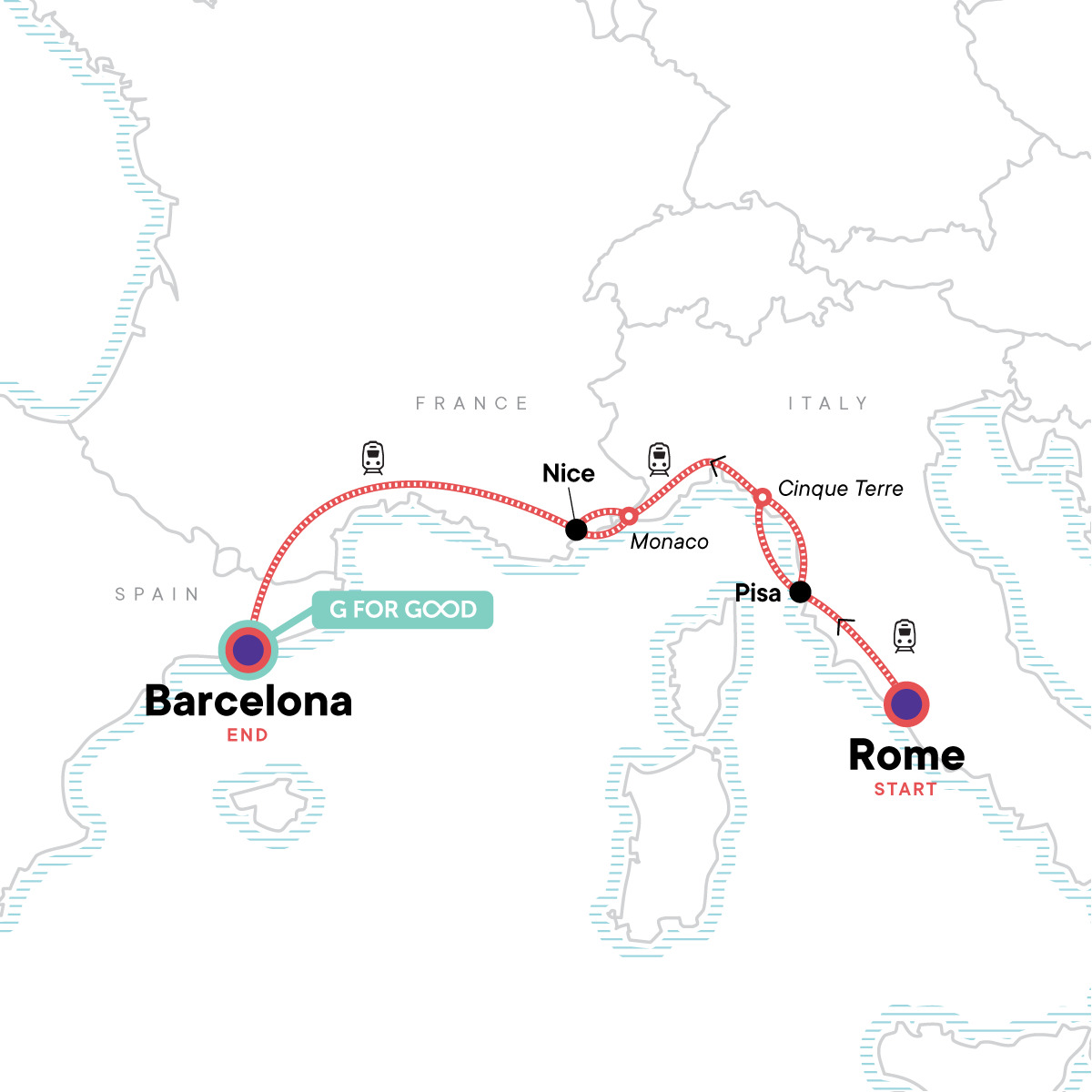 Exclusive inclusions: Transport - Climb aboard, take a seat, and enjoy the ride.Transport - Enjoy a ride on a local bus from Genoa to Nice. This ride includes a border crossing between Italy and France.Free_time - Get out and explore the beautiful French Riviera.