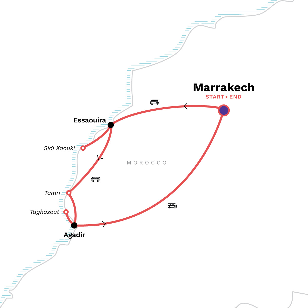 After breakfast transfer back to Marrakech, about four hours from Agadir, arriving around 12pm. The tour ends on arrival to the airport or at the Marrakech hotel for those have booked post-tour nights.