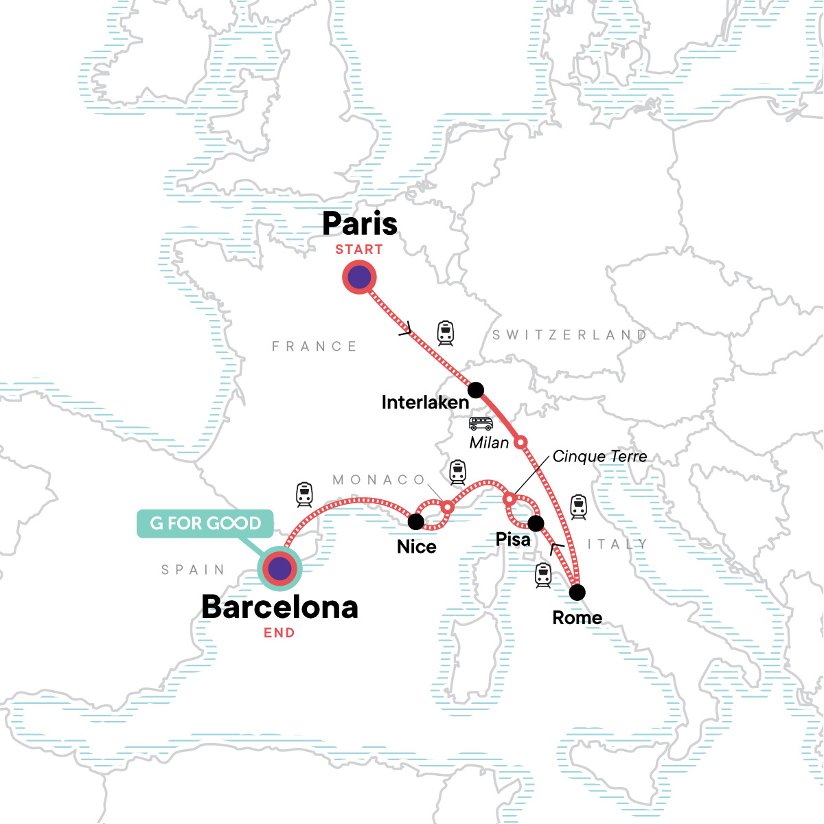 - Your G for Good Moment: Mescladis Cooking Class, Barcelona Your Welcome Moment: Welcome Moment - Meet Your CEO and Group Your First Night Out Moment: Connect With New Friends Your Discover Moment: Paris Your Foodie Moment: Eiffel Tower Picnic, Paris Your Discover Moment: Interlaken Your Big Night Out Moment: Interlaken Your Discover Moment: Rome Your Big Night Out Moment: Barcelona