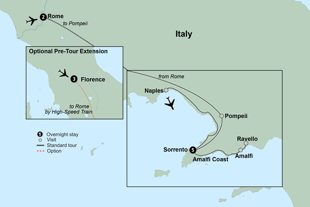 - Admittance: Rome,Spanish Steps,Trevi Fountain,Piazza Navona,Pompeii,Sorrento,Amalfi Coast,Ravello,Amalfi